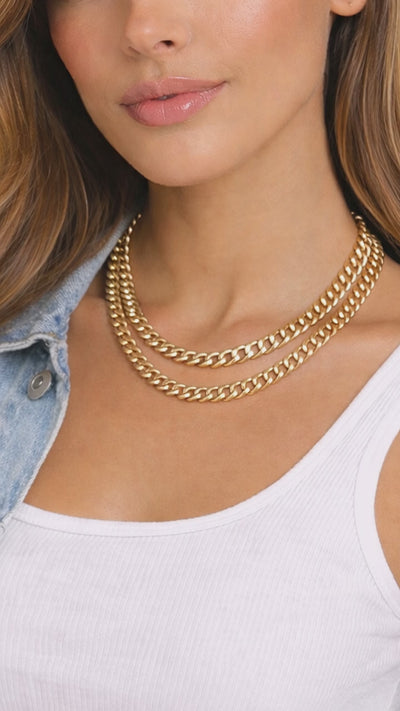 Meet the bestseller that defines bold elegance. The Zoe Curb Chain in gold is a signature Luxxy staple, designed to elevate your everyday look with effortless shine. Featuring a 9.5mm or 7mm width and an 18" length, this statement chain stuns on its own or layered with other pieces. Crafted from durable brass with a polished 14k gold plating, the Zoe delivers that modern edge, confident, versatile, and made to stand out.